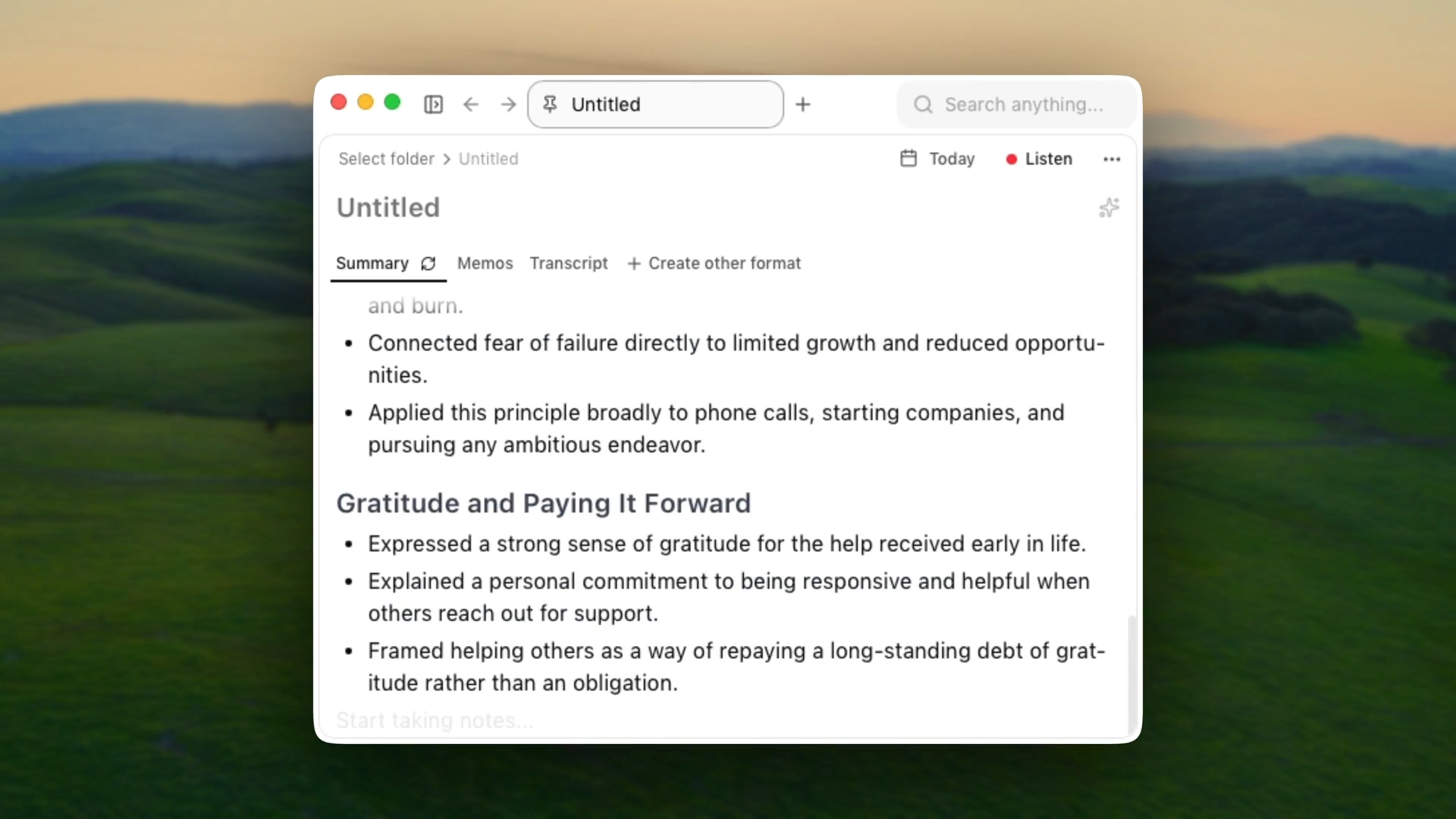- AI summaries - Combines your own notes with the transcript to produce structured summaries with action items